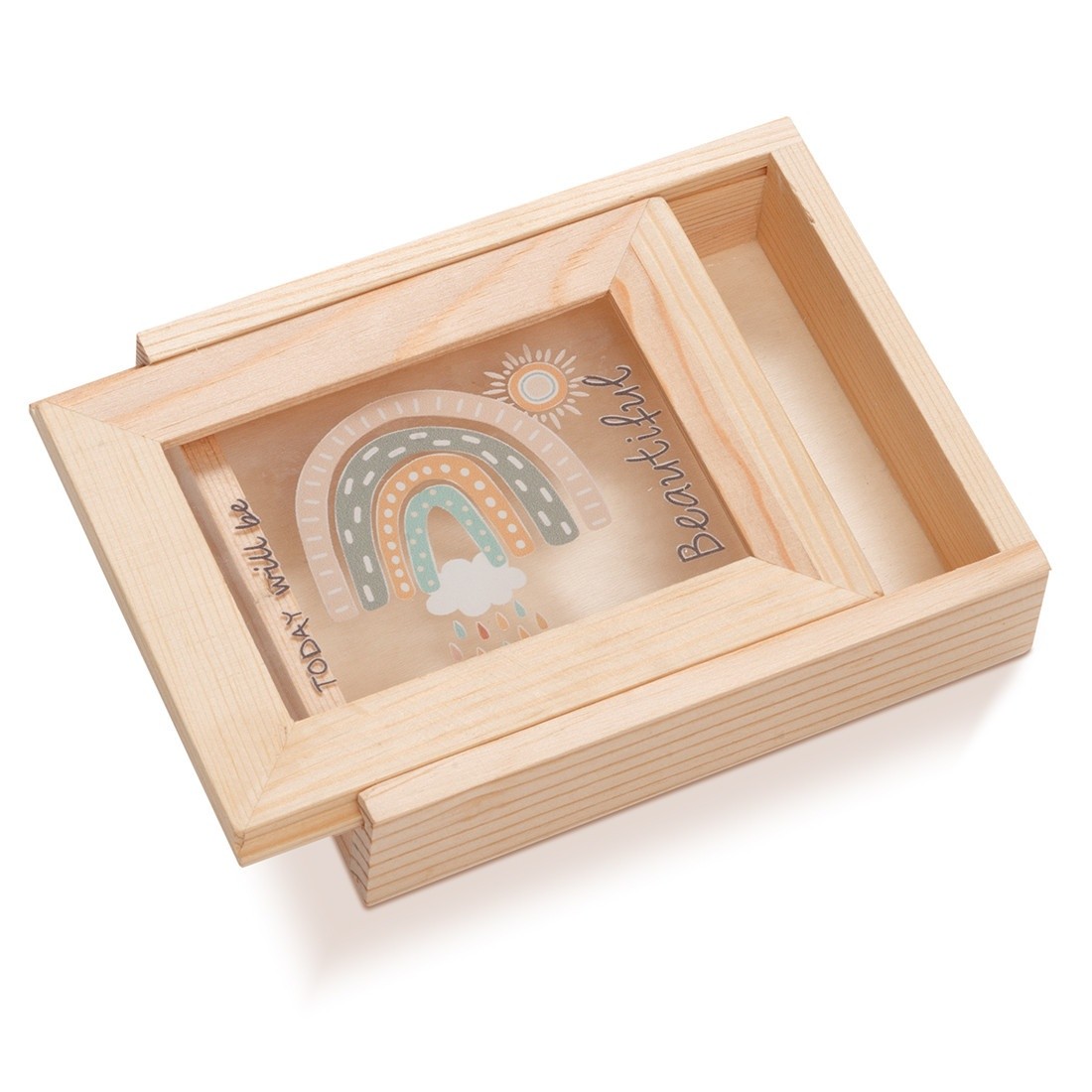 Ξύλινη κασετίνα με κορνίζα,Η κορνίζα είναι διακοσμημένη με παραλληλόγραμμο print plexiglass καδράκι σε διάφανο χρώμα.Η παράσταση απεικονίζει σε οριζόντια μορφή το ουράνιο τόξο μετά τη βροχή και moto "Today wil be beautiful".