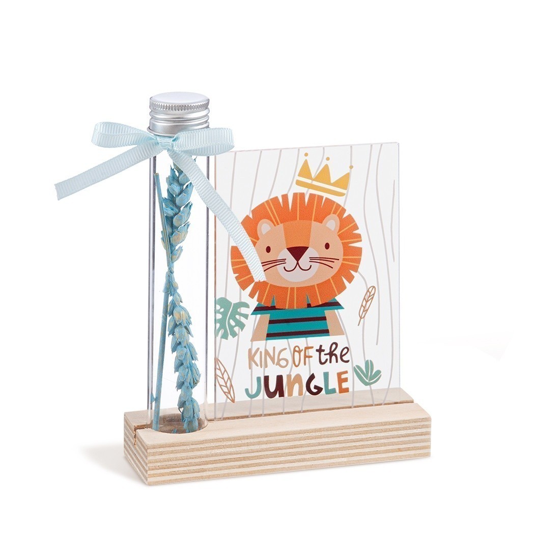 Ξύλινη βάση με print παραλληλόγραμμο καδράκι plexiglass σε διάφανο χρώμα και γυάλινο δοκιμαστικό σωλήνα.Η παράσταση απεικονίζει το λιονταράκι ως "King of the jungle".