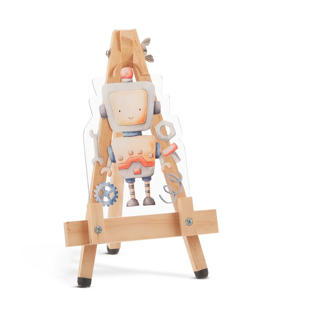 Ξύλινο καβαλέτο με print plexiglass κοπτικό.Η παράσταση απεικονίζει σε διάφανο χρώμα ένα ρομπότ με φόντο διάφορα εργαλεία.