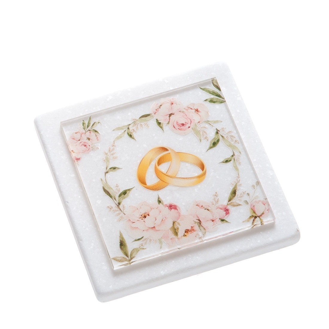 Σουβέρ από λευκό μάρμαρο και διάφανο print plexiglass σε σχήμα τετράγωνο. Η παράσταση απεικονίζει τις χρυσές βέρες μέσα σε ένα στεφανάκι από ροζ παιώνια.