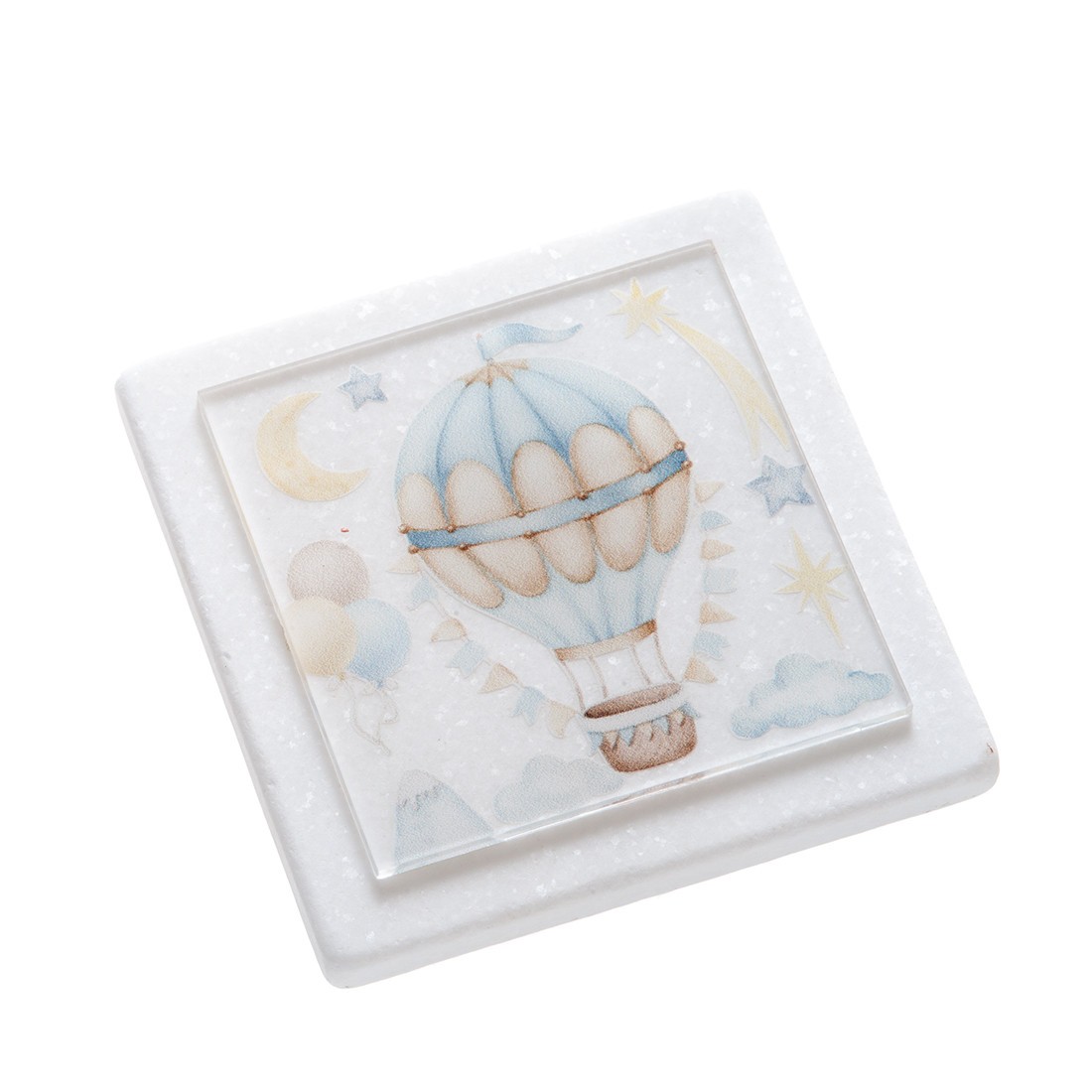Σουβέρ από λευκό μάρμαρο και διάφανο print plexiglass σε σχήμα τετράγωνο. Η παράσταση απεικονίζει το αερόστατο σε σιέλ αποχρώσεις.