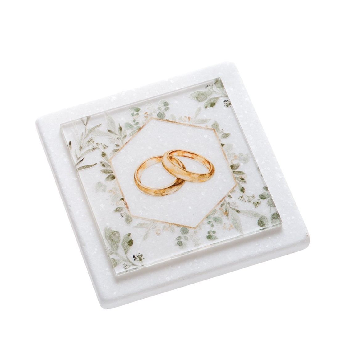 Σουβέρ από λευκό μάρμαρο και διάφανο print plexiglass σε σχήμα τετράγωνο. Η παράσταση απεικονίζει χρυσές βέρες μέσα σε ένα στεφανάκι από πράσινο ευκάλυπτο.