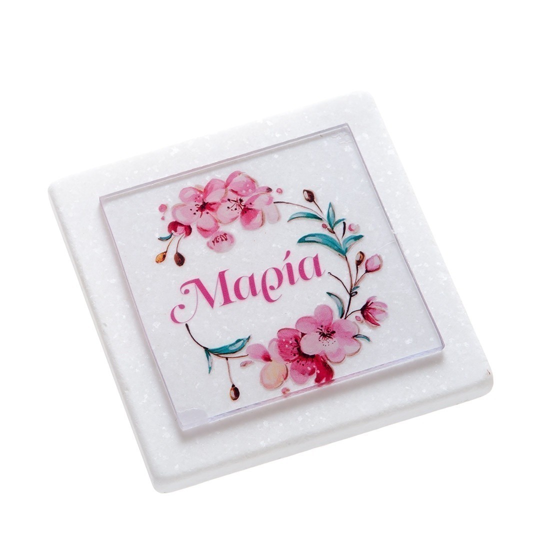 Σουβέρ από λευκό μάρμαρο και διάφανο print plexiglass σε σχήμα τετράγωνο. Η παράσταση απεικονίζει Η παράσταση απεικονίζει σε διάφανο χρώμα στεφάνι από ροζ λουλούδια και στην μέση το όνομα του παιδιού.