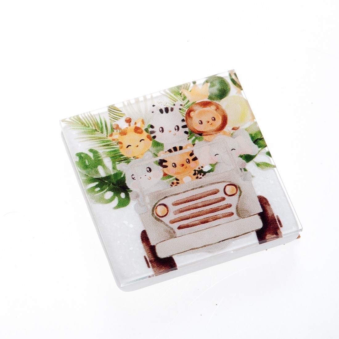 Σουβέρ από λευκό μάρμαρο και διάφανο print plexiglass σε σχήμα τετράγωνο. Η παράσταση απεικονίζει τα ζωάκια της ζούγκλας να πηγαίνουν για safari.