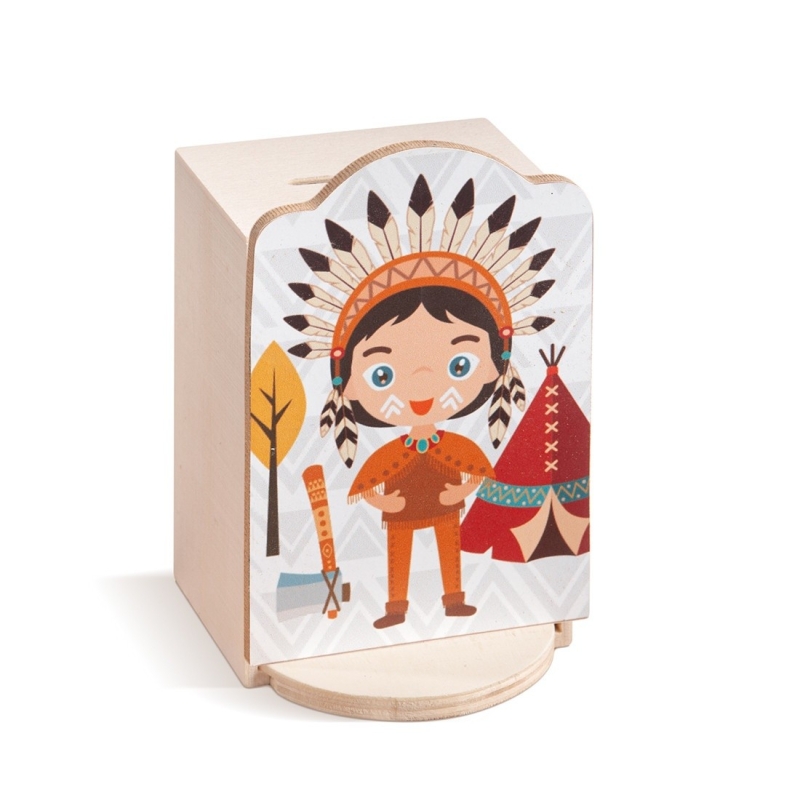 Ξύλινος κουμπαράς με κοπτικό.Η παράσταση απεικονίζει έναν μικρό ινδιάνο.