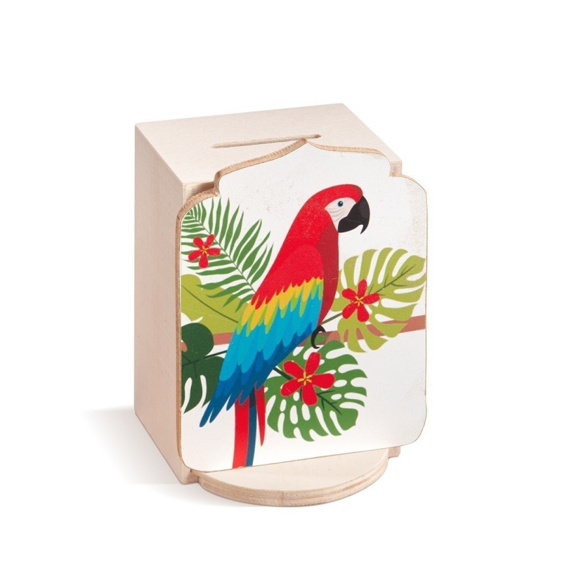 Ξύλινος κουμπαράς με κοπτικό.Η παράσταση απεικονίζει έναν πολύχρωμο παπαγάλο.