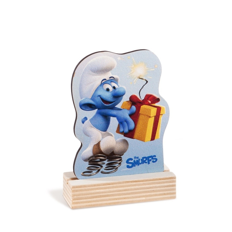 Ξύλινη βάση με κοπτικό.Η παράσταση απεικονίζει ένα στρουμφάκι να κρατάει ένα δώρο στα χέρια του.