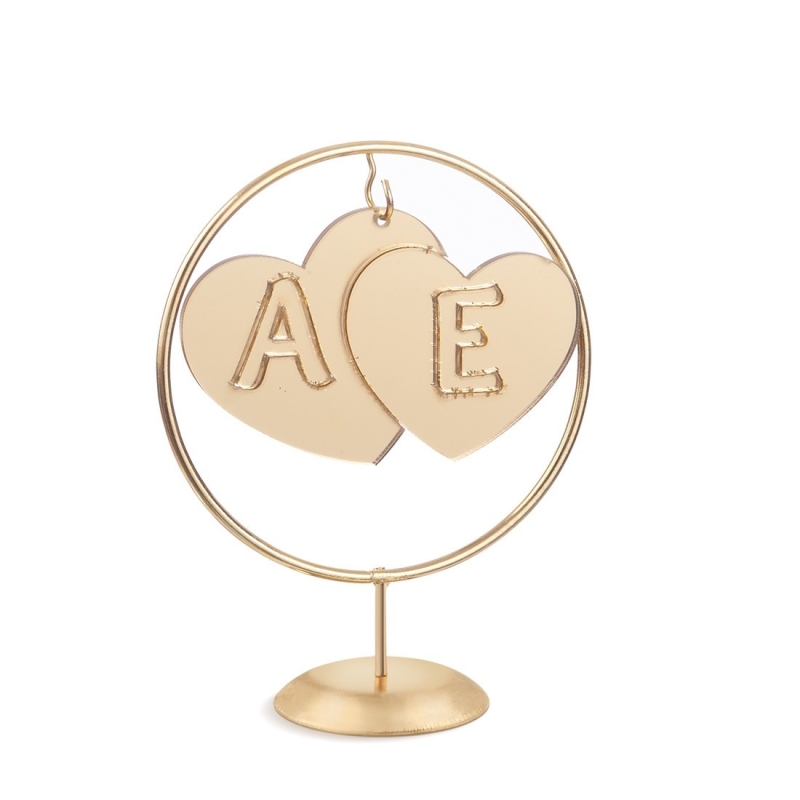 Μεταλλική βάση με χρυσές καρδιές με μονογράμματα από καθρέφτη plexiglass.