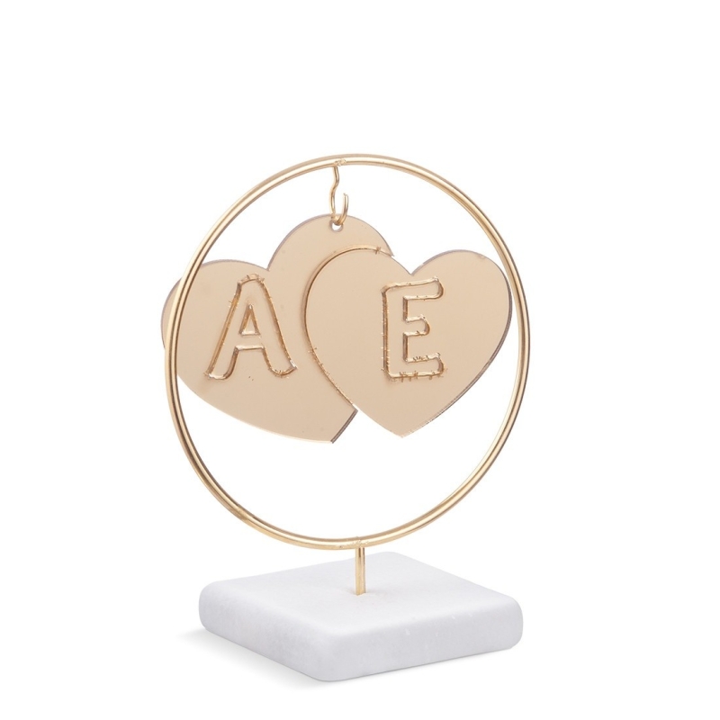 Γύψινη βάση με μεταλλικό κρίκο και χρυσές καρδιές με μονογράμματα από καθρέφτη plexiglass.