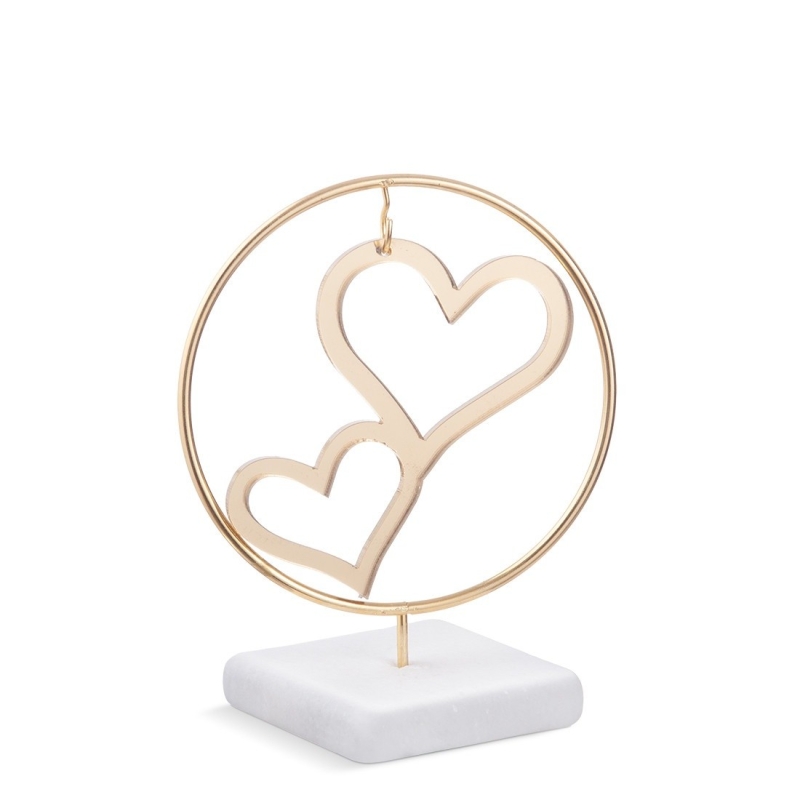 Γύψινη βάση με μεταλλικό κρίκο και χρυσές ανισόπεδες καρδιές από καθρέφτη plexiglass.