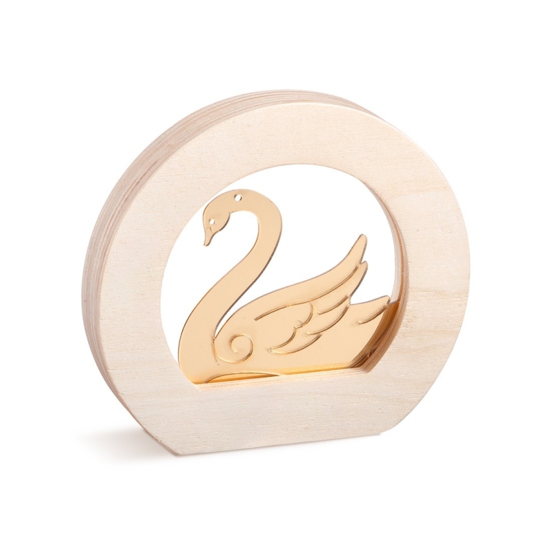 Ξύλινο καδράκι σε φυσικό χρώμα διακοσμημένο με χρυσό plexiglass-καθρέφτη κοπτικό κύκνος.