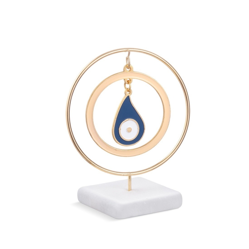 Επιτραπέζιο διακοσμητικό σύνθεση με διαφορετικά υλικά.Ο κωδικός αποτελείται από : 1) Γύψινη βάση 2)μεταλλικό κρίκο 3)μεταλλικό κρεμαστό δάκρυ ματάκι blue navy σε στρογγυλό πλαίσιο.