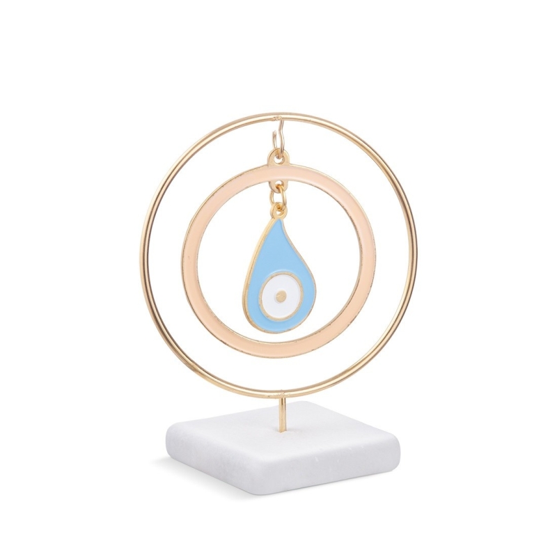 Επιτραπέζιο διακοσμητικό σύνθεση με διαφορετικά υλικά.Ο κωδικός αποτελείται από : 1) Γύψινη βάση 2)μεταλλικό κρίκο 3)μεταλλικό κρεμαστό δάκρυ ματάκι σιελ σε στρογγυλό πλαίσιο.