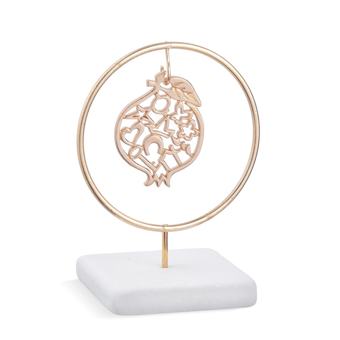 Επιτραπέζιο διακοσμητικό σύνθεση με διαφορετικά υλικά. Ο κωδικός αποτελείται από : 1) Γύψινη βάση 2)μεταλλικό κρίκο 3) μεταλλικό μοτίφ ρόδι σε χρυσό χρώμα.