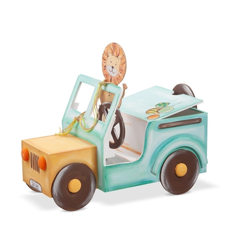 SAFARI ADVENTURE. Ξύλινο κουτί βάπτισης σε σχήμα αυτοκινητάκι-τρενάκι. Το χρώμα του είναι βεραμάν και κίτρινο με καφέ λεπτομέρεις. Το λιονταράκι,ο βασιλιάς της ζούγκλας, κάθεται στο τίμονι και δίνει το σύνθημα για να ξεκινήσει το "Safari Adventure".