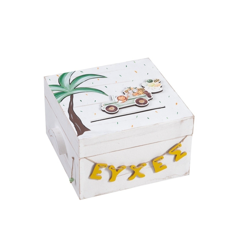 Ξύλινο τετράγωνο κουτί ευχών σε λευκό χρώμα. Οι λέξη "ευχές" είναι βαμμένες κίτρινες. Στο επάνω μέρος είναι ζωγραφισμένος ένας φοίνικας και υπάρχει ξύλινη παράσταση με τα ζωάκια της ζούγκλας να πηγαίνουν για safari.