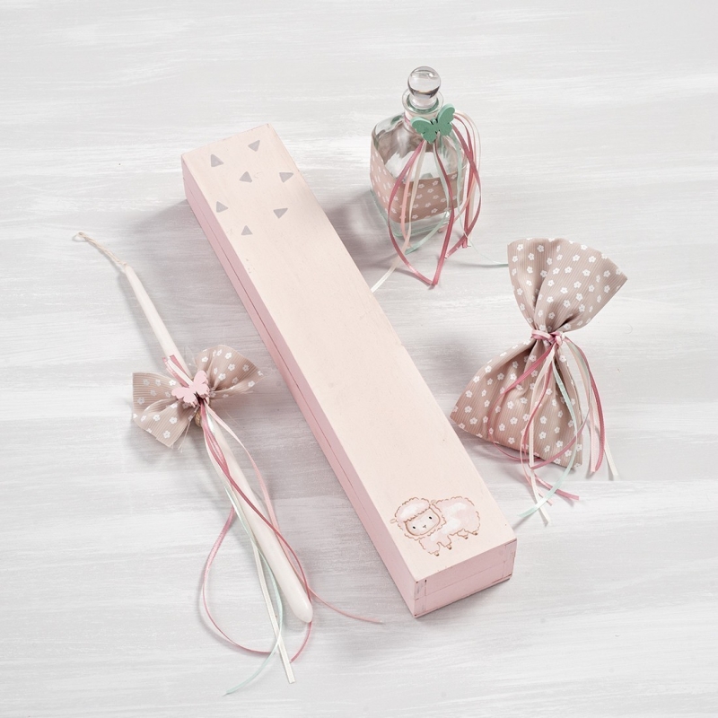 Σετ λαδικών με ξύλινο ροζ κουτί συσκευασίας για τα κεριά και ζωγραφισμένο με ένα προβατάκι. Ο κωδικός περιλαμβάνει στολισμένα 3 κεράκια, σαπούνι μέσα σε πουγκί και μπουκαλάκι λαδιού.