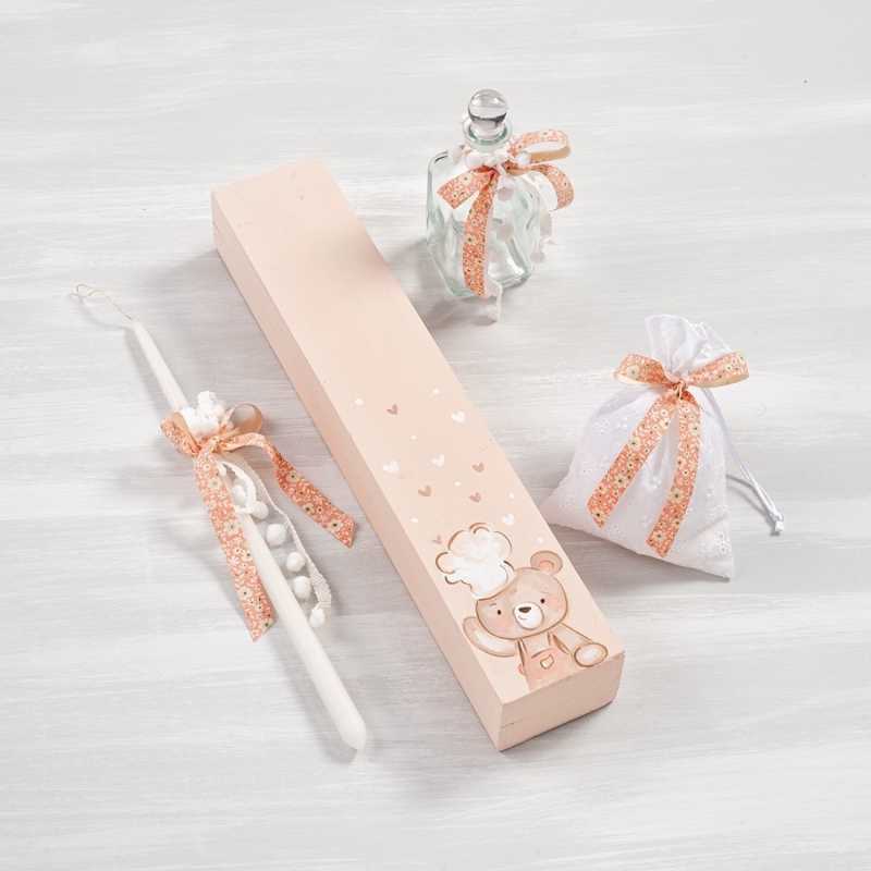 Σετ λαδικών με ξύλινο σομόν κουτί συσκευασίας για τα κεριά και ζωγραφισμένο με ένα αρκουδάκι-μάγειρα. Ο κωδικός περιλαμβάνει στολισμένα 3 κεράκια, σαπούνι μέσα σε πουγκί και μπουκαλάκι λαδιού.