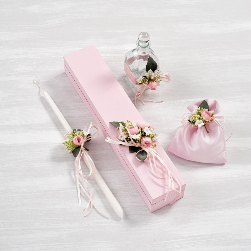 Σετ λαδικών με ξύλινο ροζ κουτί συσκευασίας για τα κεριά και στολισμένο με λουλούδια. Ο κωδικός περιλαμβάνει στολισμένα 3 κεράκια, σαπούνι μέσα σε πουγκί και μπουκαλάκι λαδιού.