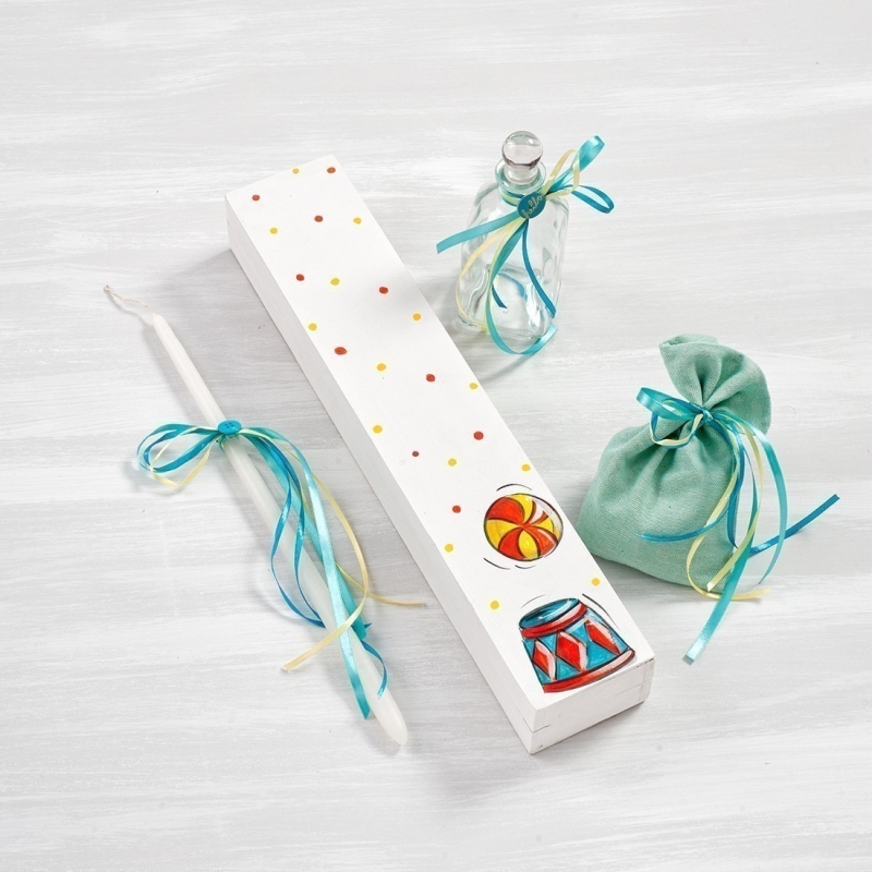 Σετ λαδικών με ξύλινο λευκό κουτί συσκευασίας για τα κεριά και ζωγραφισμένο με στοιχεία του τσίρκου. Ο κωδικός περιλαμβάνει στολισμένα 3 κεράκια, σαπούνι μέσα σε πουγκί και μπουκαλάκι λαδιού.
