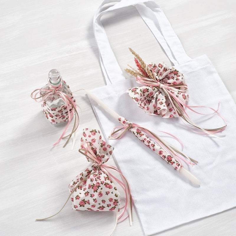 Υφασμάτινη τσάντα με 3 κεριά, σαπούνι και μπουκάλι λαδιού στολισμένα σε ροζ floral αποχρώσεις.