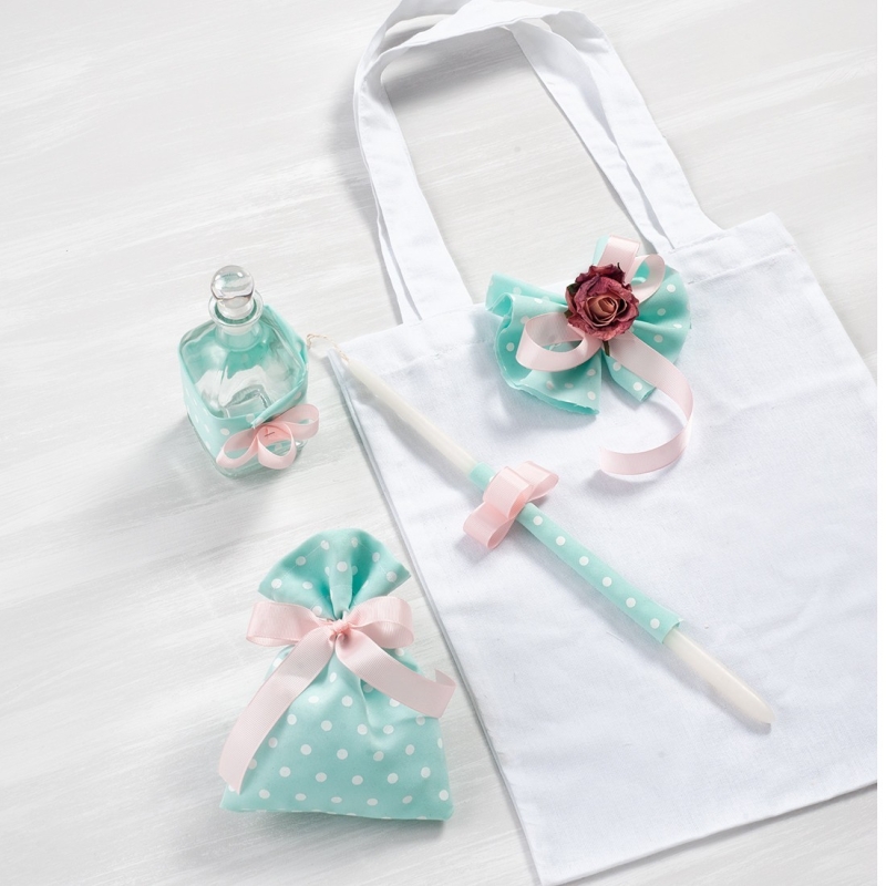 Υφασμάτινη τσάντα με 3 κεριά, σαπούνι και μπουκάλι λαδιού στολισμένα σε πουά βεραμάν αποχρώσεις.