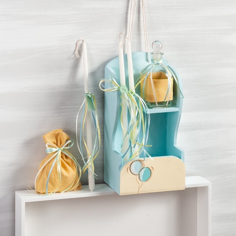 Ξύλινο ράφι λαδικών σε σιέλ-κίτρινο χρώμα και ζωγραφισμένο με μπαλόνια. Ο κωδικός περιλαμβάνει στολισμένα 3 κεράκια, σαπούνι μέσα σε πουγκί και μπουκαλάκι λαδιού.