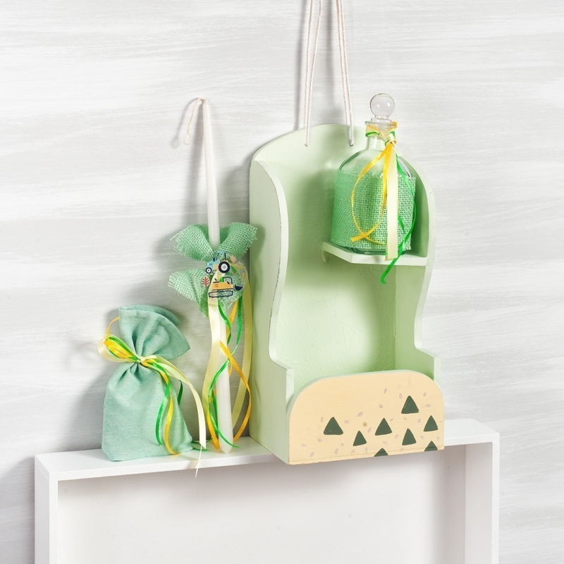 Ξύλινο ράφι λαδικών σε βεραμάν και κίτρινο χρώμα. Ο κωδικός περιλαμβάνει στολισμένα 3 κεράκια, σαπούνι μέσα σε πουγκί και μπουκαλάκι λαδιού.