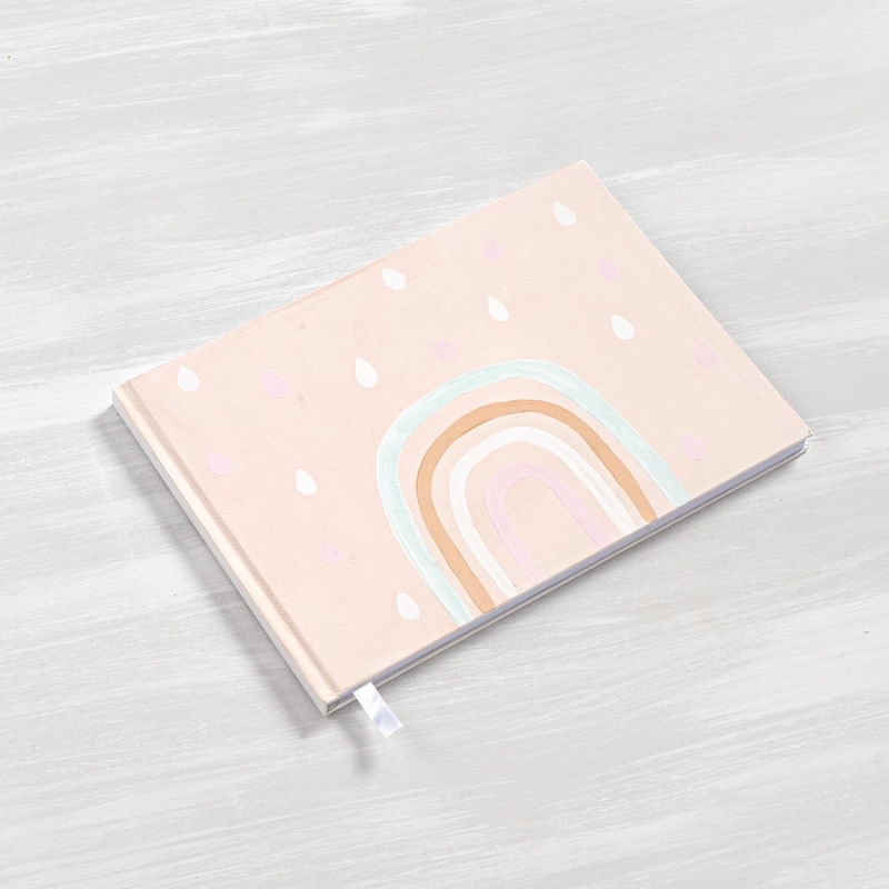Βιβλίο ευχών με εξώφυλλο από χοντρό χαρτόνι σε ροζ χρώμα και ζωγραφισμένο με ουράνιο τόξο.