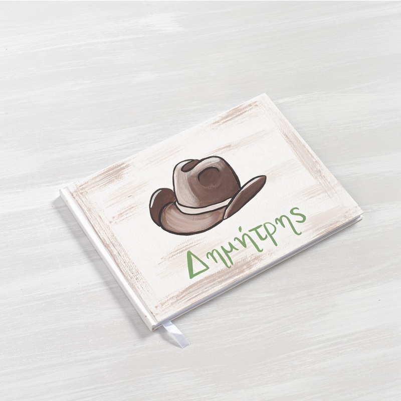 Βιβλίο ευχών με εξώφυλλο από χοντρό χαρτόνι σε λευκό χρώμα με καφέ σβησίματα και ζωγραφισμένο με το καπέλο του cowboy.