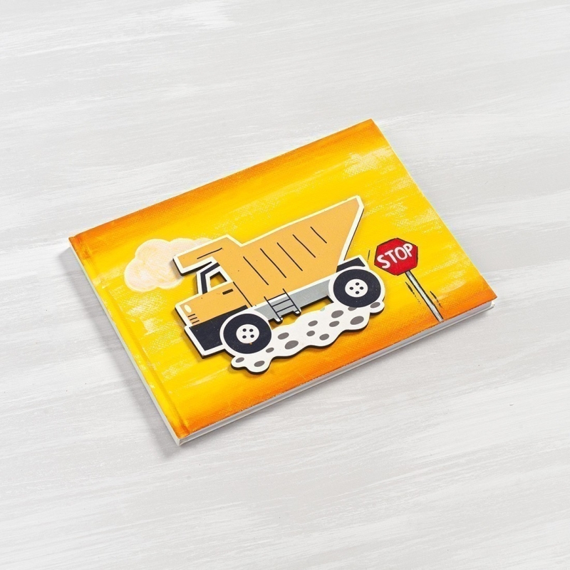 Βιβλίο ευχών με εξώφυλλο από χοντρό χαρτόνι σε κίτρινο χρώμα και διακοσμημένο με κοπτικό φορτηγό.