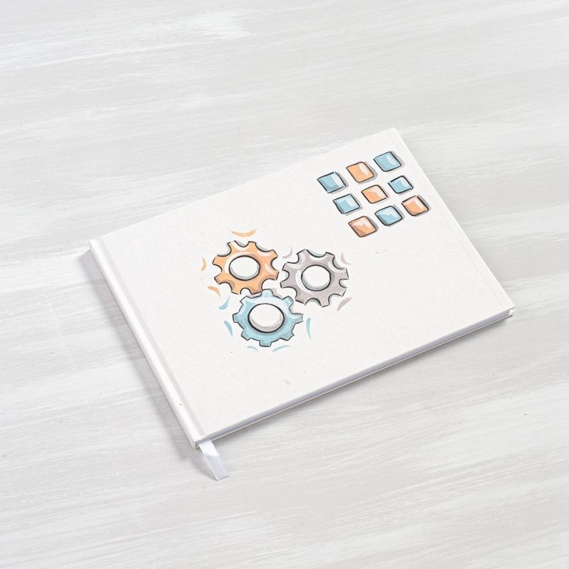 Βιβλίο ευχών με εξώφυλλο από χοντρό χαρτόνι σε λευκό χρώμα και ζωγραφισμένο με εργαλεία ρομπότ.