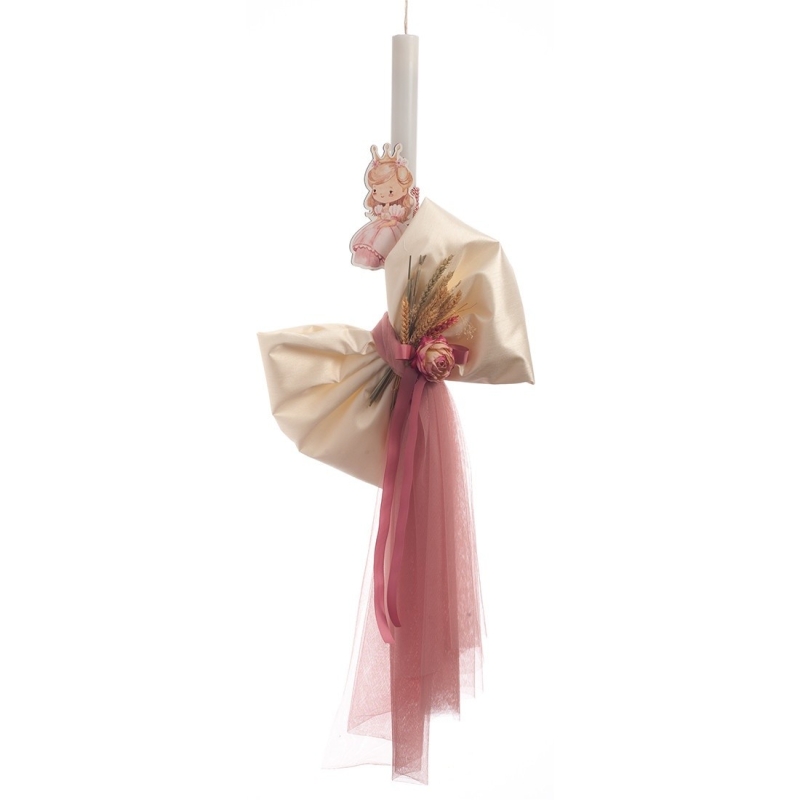 Λαμπάδα βάπτισης με θέμα την πριγκίπισσα. Η λαμπάδα είναι στολισμένη με εκρού φιόγκο από ταφτά και ριχτό πουά τούλι σε σάπιο μήλο. Τη διακόσμηση ολοκληρώνουν ένα μπουκέτο με αποξηραμένα λουλούδια και το ξύλινο κοπτικό πριγκίπισσα.