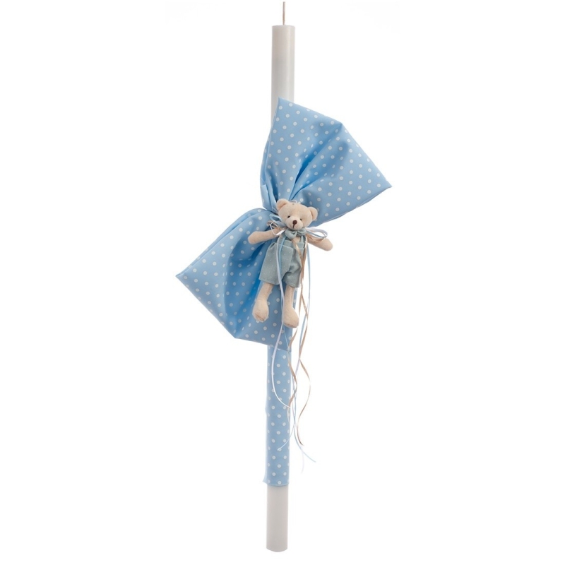 Λαμπάδα βάπτισης ντυμένη και στολισμένη με φιόγκο από πουά σιέλ ύφασμα. Η διακόσμηση περιλαμβάνει λούτρινο αρκουδάκι με σιέλ σαλοπέτα.