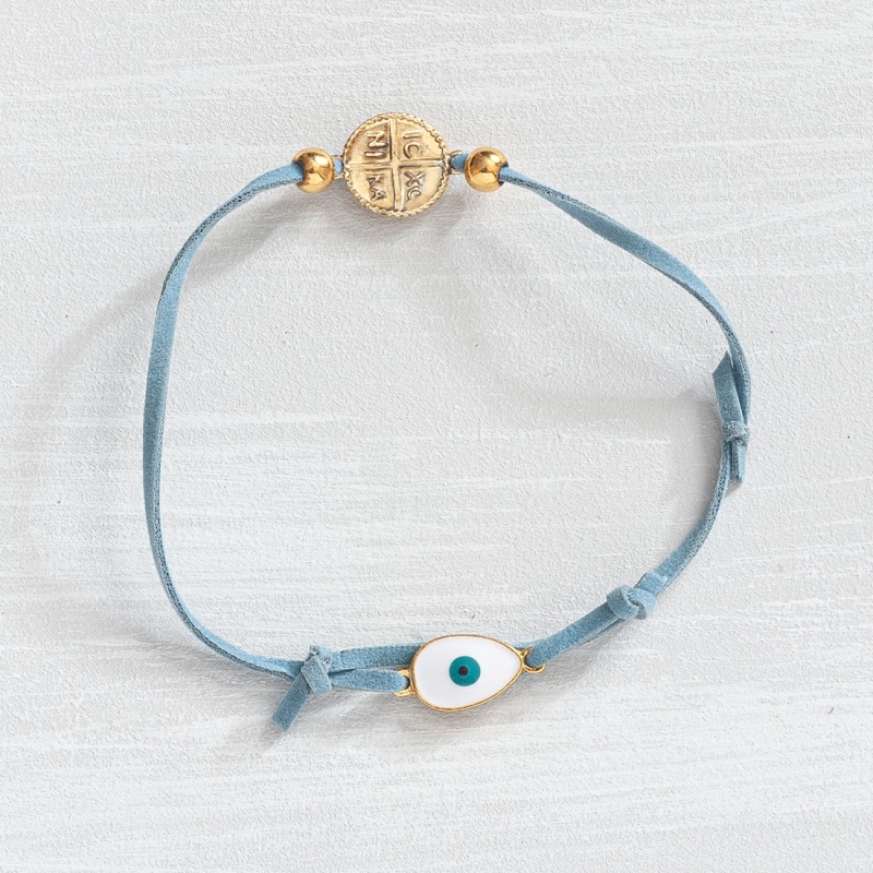Μαρτυρικό βραχιόλι suede σε σιέλ απόχρωση με χρυσό μοτίφ κωνσταντινάτο και λευκό ματάκι.