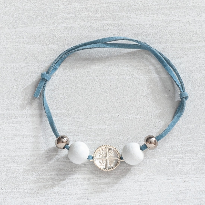 Μαρτυρικό βραχιόλι suede σε σιέλ απόχρωση με ασημί μοτίφ κωνσταντινάτο και ξύλινες χάντρες σε λευκό χρώμα.
