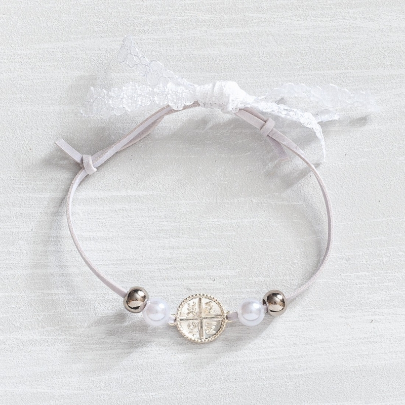 Μαρτυρικό βραχιόλι suede σε λευκή απόχρωση με ασημί μοτίφ κωνσταντινάτο και πέρλες.