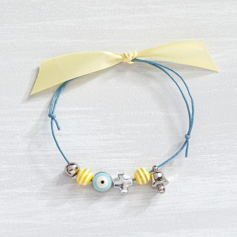 Μαρτυρικό βραχιόλι σε σιέλ απόχρωση με περαστό ασημί σταυρό, σιέλ ματάκι και ριγέ κίτρινες χάντρες.