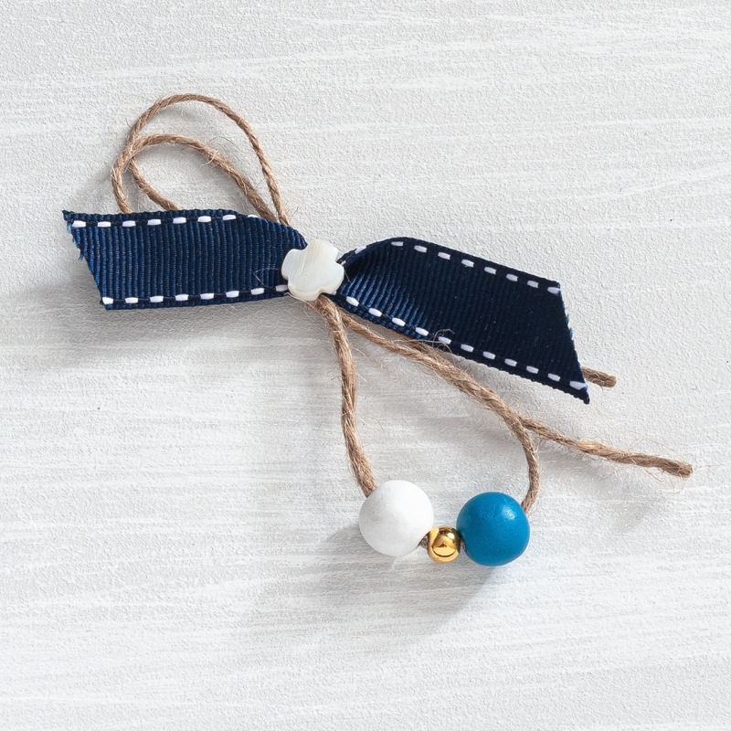 Μαρτυρικό δετό σε ακανόνιστο φιόγκο με λευκό φίλντισι, γκρο blue navy κορδέλα με γαζί και ξύλινες χάντρες.