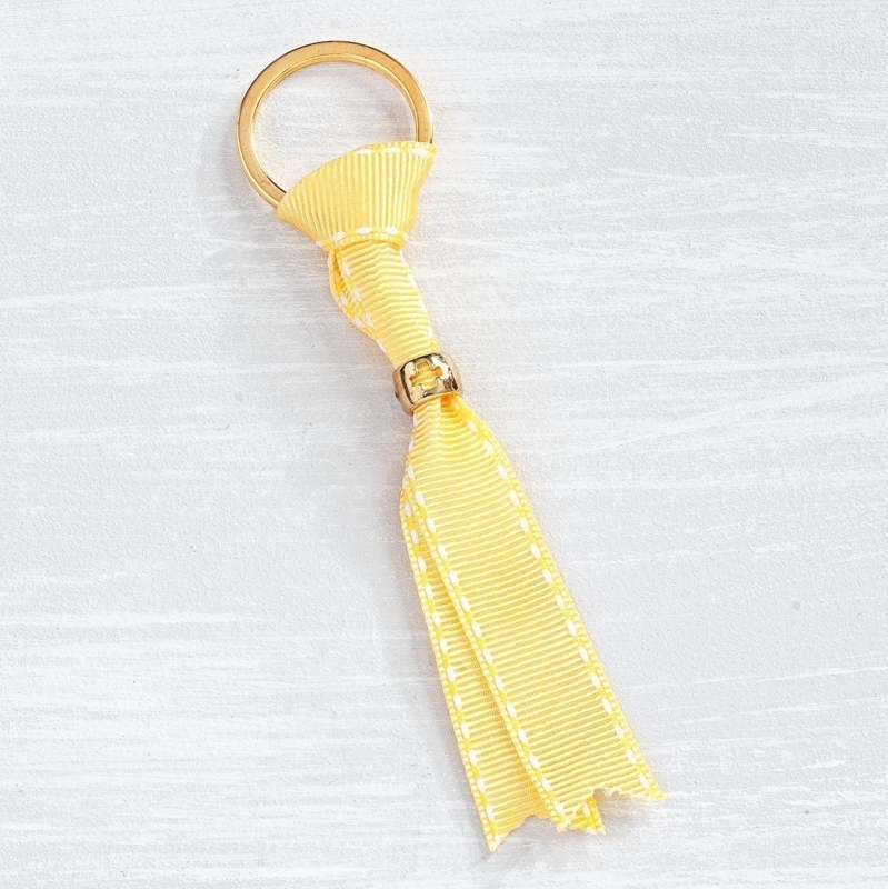 Μαρτυρικό μπρελόκ με δέσιμο σε σχήμα γραβάτας. Η κορδέλα είναι κίτρινο γκρο με λευκό γαζί και ο σταυρός χρυσό δαχτυλίδι.