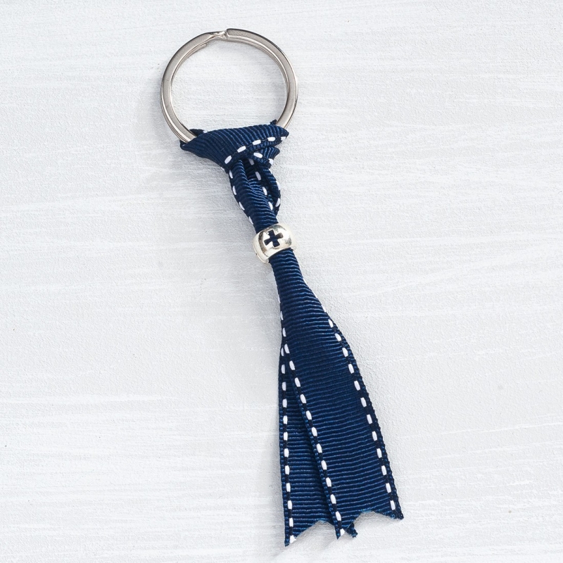 Μαρτυρικό μπρελόκ με δέσιμο σε σχήμα γραβάτας. Η κορδέλα είναι blue navy γκρο με λευκό γαζί και ο σταυρός ασημί δαχτυλίδι.