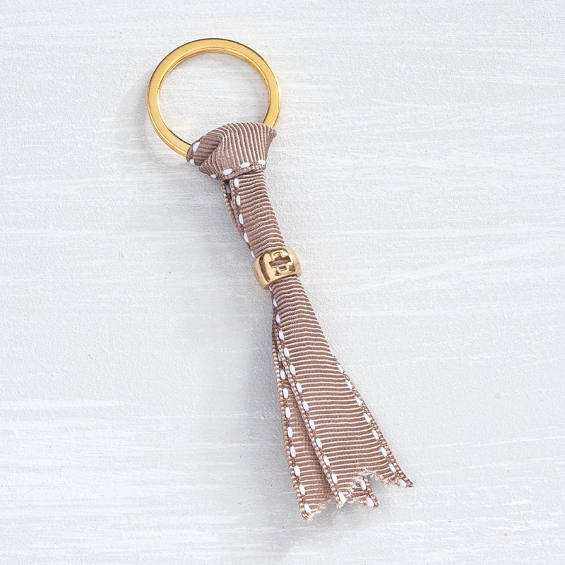 Μαρτυρικό μπρελόκ με δέσιμο σε σχήμα γραβάτας. Η κορδέλα είναι μόκα γκρο με λευκό γαζί και ο σταυρός χρυσό δαχτυλίδι.