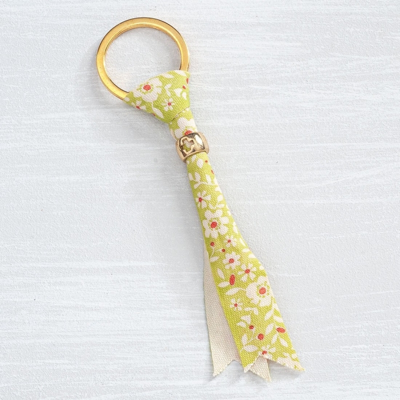 Μαρτυρικό μπρελόκ με δέσιμο σε σχήμα γραβάτας. Η κορδέλα είναι floral λαχανί και ο σταυρός χρυσό δαχτυλίδι.