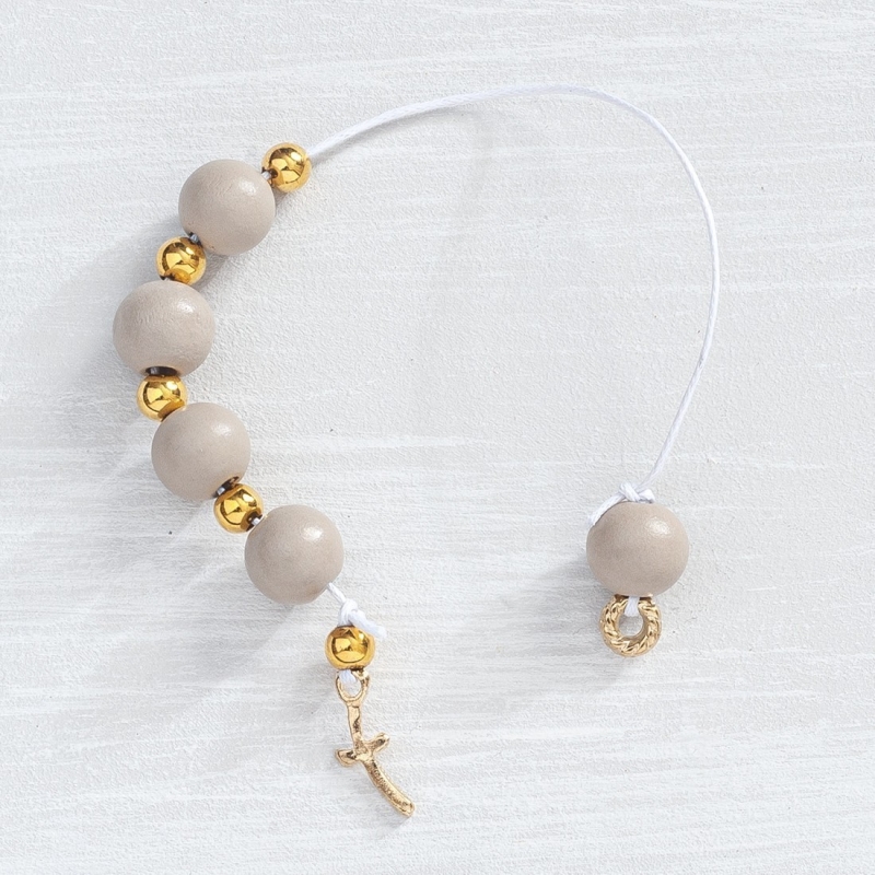 Μαρτυρικό μικρό κομπολόι με χρυσό σταυρό και ξύλινες γκρι χάντρες.