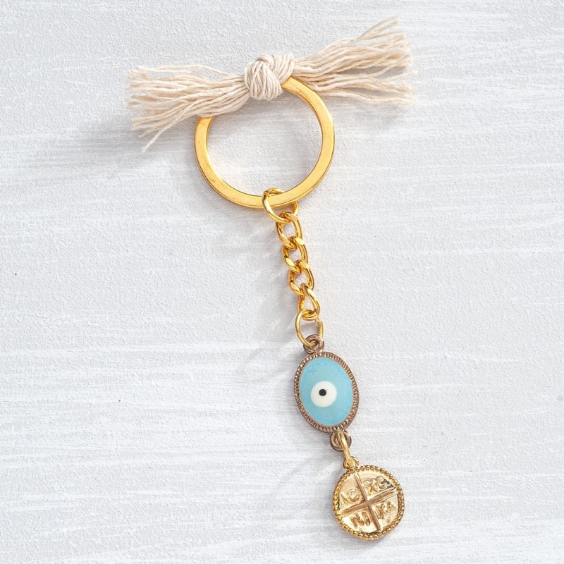 Μαρτυρικό μπρελόκ με κρεμαστό χρυσό κωνσταντινάτο, ματάκι σιέλ και βαμβακερό εκρού κορδόνι.