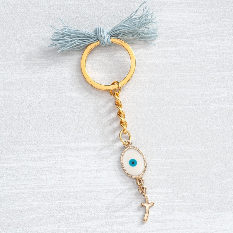 Μαρτυρικό μπρελόκ με κρεμαστό χρυσό σταυρό, ματάκι λευκό και βαμβακερό σιέλ κορδόνι.