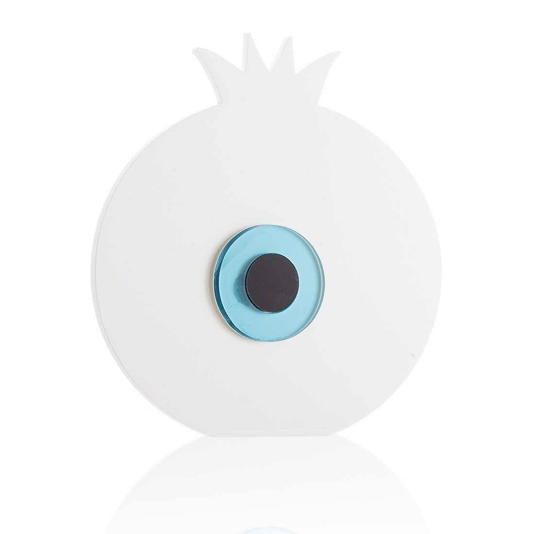 Plexiglass στρογγυλό ρόδι σε λευκό χρώμα. Στη μέση είναι διακοσμημένο με στρογγυλό ματάκι σιέλ-μαύρο.