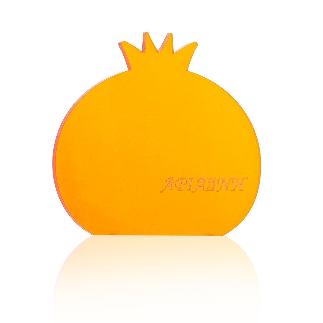 Plexiglass οβάλ ρόδι σε διάφανο πορτοκαλί χρώμα με χαραγμένο το όνομα.
