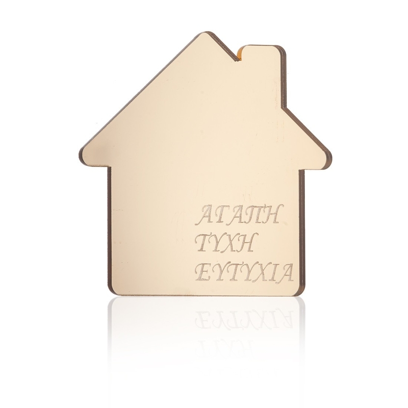 Plexiglass σπιτάκι σε χρυσό καθρέπτη και χαραγμένες τις ευχές "ΑΓΑΠΗ, ΤΥΧΗ, ΕΥΤΥΧΙΑ".