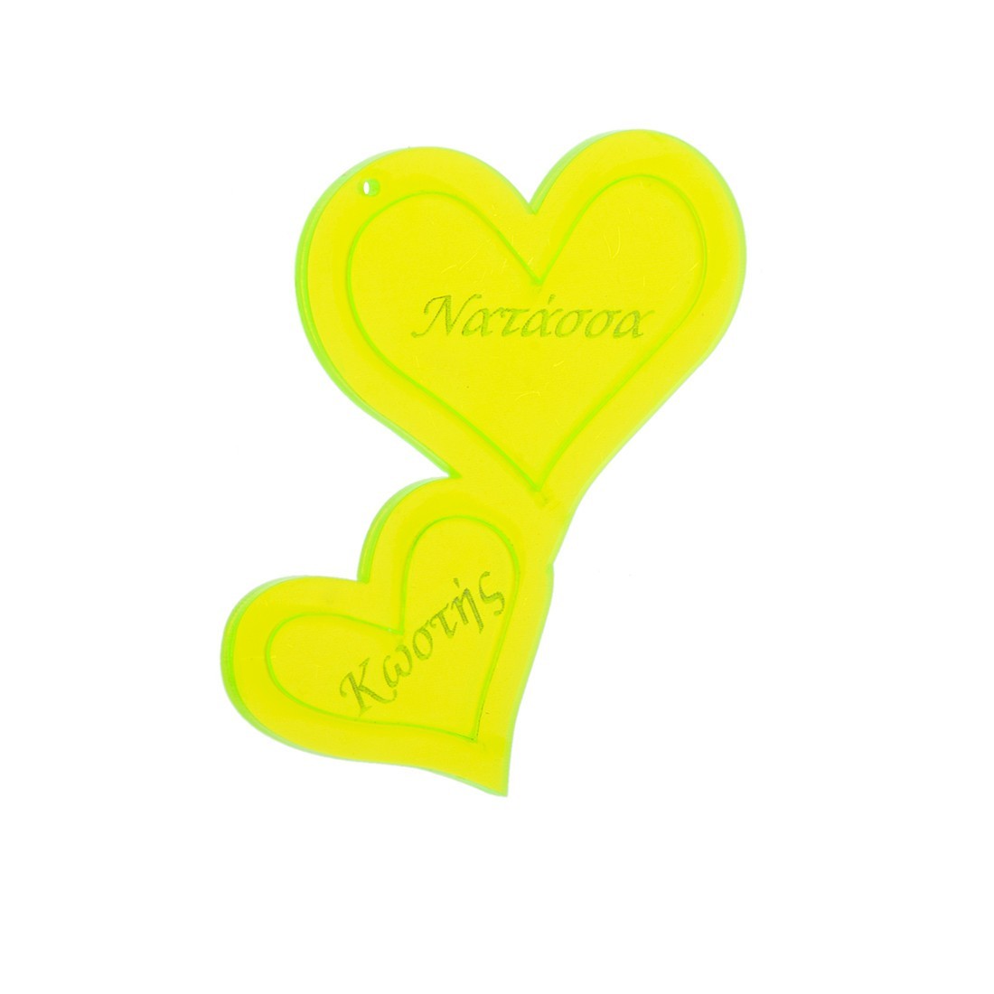 Plexiglass ανισόπεδες καρδιές σε κίτρινο fluo χρώμα και χαραγμένα τα ονόματα.